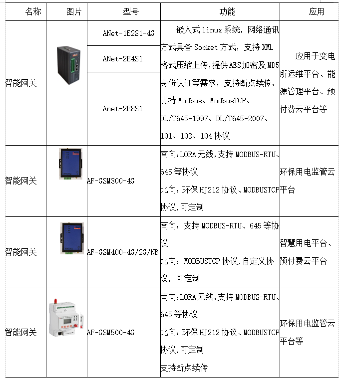 安科瑞根據(jù)多年來的項目經(jīng)驗,結合用戶實際需求,開發(fā)了各類有線、區(qū)域無線、廣域無線通訊產(chǎn)品,包括網(wǎng)關和終端設備。支持RS485、以太網(wǎng)、LORA、ZigBee、GPRS、4G、NB-IOT等多種通訊方式,隨著5G建設步伐的加快,未來將會有越來越多的通訊方式融入產(chǎn)品,服務于泛在電力物聯(lián)網(wǎng)建設。