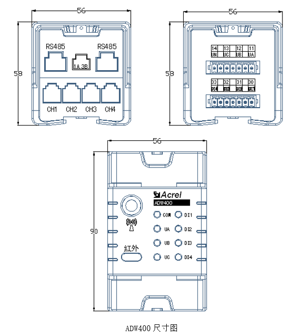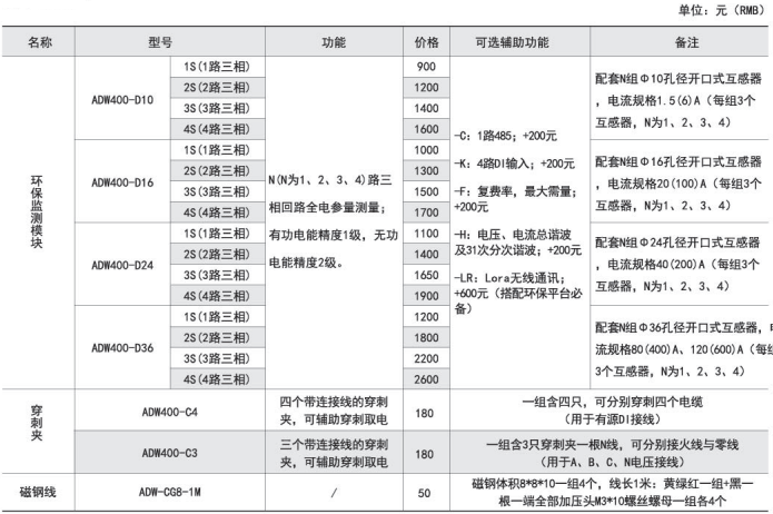 ADW400環(huán)保監(jiān)測(cè)模塊主要用于計(jì)量低壓網(wǎng)絡(luò)的三相有功電能,同時(shí)可選擇四個(gè)回路的電流輸入,具有RS485通訊和470MHz無線通訊功能,方便用戶進(jìn)行用電監(jiān)測(cè)、集抄和管理??伸`活安裝于配電箱內(nèi),實(shí)現(xiàn)對(duì)不同區(qū)域和不同負(fù)荷的分項(xiàng)電能計(jì)量,統(tǒng)計(jì)和分析。